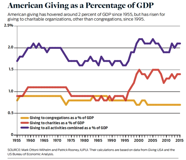 Recognizing and unpacking these fallacies reveals that American giving has been changing dynamically over time. If all giving is divided into two components—for example, giving to charitable organizations that provide basic needs, human services, education, health, and the arts on the one hand, and giving to congregations on the other—one sees that the percentage of GDP given to charitable organizations increases. (Compare the red and gold lines in “American Giving as a Percentage of GDP” on this page) Simultaneously, the percentage going to congregations drops—not a surprise, because fewer Americans are claiming a religious affiliation. But even the decline in giving to congregations obscures the fact that many charitable organizations have a religious identity.