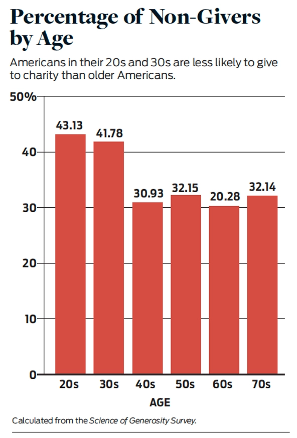 National studies, such as those conducted by the General Social Survey and Bureau of Labor Statistics, have documented declines in youth participation in charitable giving, volunteering, voting, social forms of religious engagement, and other forms of political and civic activity. For example, research by coauthor Patricia Snell Herzog shows significantly higher proportions of non-givers among people in their 20s and 30s than those 40 and older. (See “Percentage of Non-Givers by Age” on this page.)