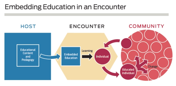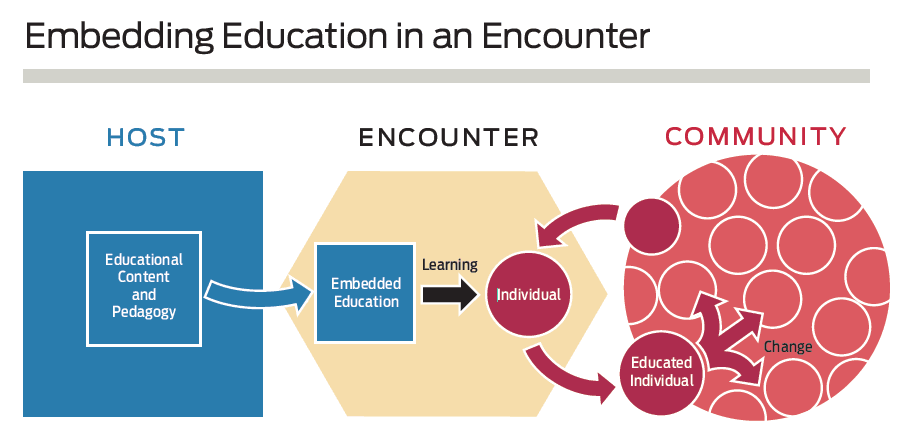 The final level of embeddedness has to do with the position the individuals on the receiving end of the education occupy within their communities. We are all embedded in families, neighborhoods, and social networks. When individuals share what they have learned with the people they know, the learning has ripple effects and eventually becomes, in a sense, embedded in a broader community, which may benefit from the knowledge and ensuing sense of empowerment that the individual brings home from the embedded education encounter. (For a diagram of how this works, see “Embedding Education in an Encounter” below.)