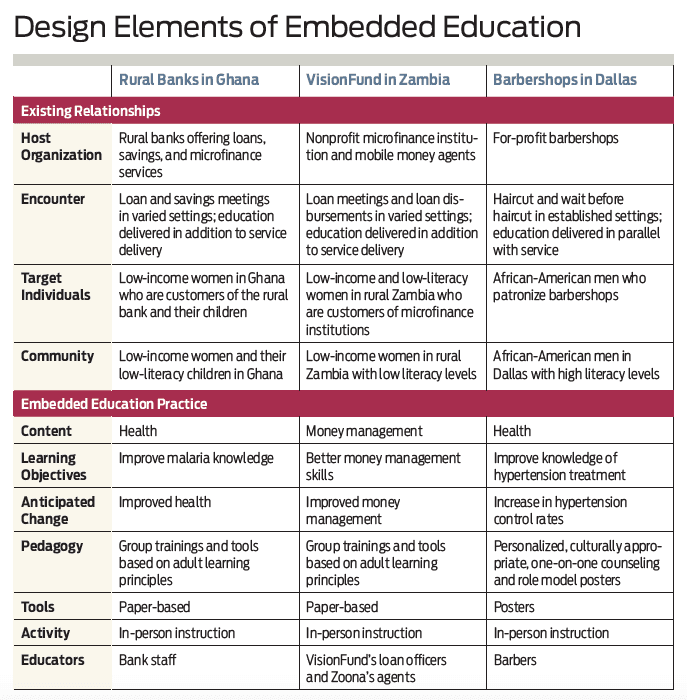 Embedded in what? | The organizations that designed, developed, and supported the implementation of the programs (“program designers”) in Ghana, Zambia, and Dallas were focused on creating embedded education programs that produced specific outcomes: malaria prevention, money management, and hypertension control. The host organizations that the program designers chose to work with represented a variety of different organizational types, and differed in the services they delivered and whom they served. In Ghana the hosts were rural banks; in Zambia they were a nonprofit MFI and a B corporation (Zoona); and in Dallas the hosts were for-profit small businesses (barbershops).