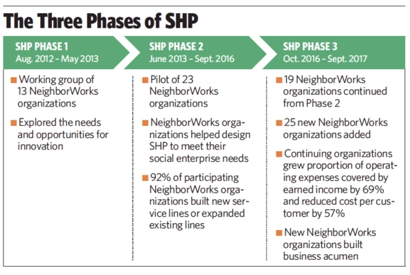 Social enterprise—earning income through commercial activity to advance a social mission— could drive those essential changes. Our first effort to shift the NeighborWorks network in this direction was to launch the Sustainable Homeownership Project (SHP) in 2012, a social enterprise capacity-building and learning-lab pilot created in partnership with members of the network.