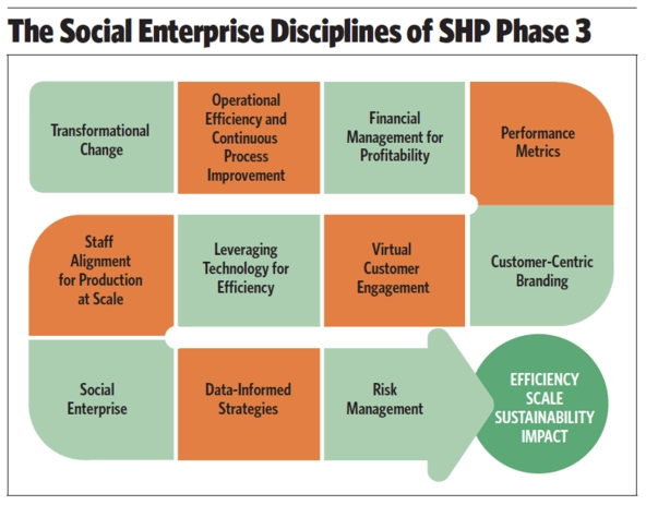 In this third phase, SHP was structured more formally as a pathway of 11 consecutive knowledge and skill areas—social enterprise “disciplines.” (See “The Social Enterprise Disciplines of SHP Phase 3” below.) These began with individualized coaching to help network organizations adopt social enterprise culture and covered topics such as financial management, marketing, operational efficiency, and performance metrics. As participants moved through the curriculum, SHP offered a range of comprehensive supports, including access to experts with technical skills, a technology tool, and more.