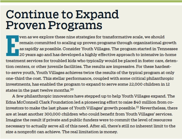 Taking “what works” to transformative scale will be the defining challenge of the social sector in the coming decade. The hard work of figuring out how to do that has begun. Now we need to test which strategies are truly practical, perfect them, and ultimately push ourselves to new ways of thinking and acting that will determine our ability to address in full the most important challenges facing this country and the world.