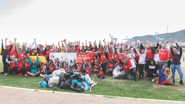E.ON Italia employees and their families celebrate after clearing Zinola beach near Savona, Italy, of plastic waste as part of the company’s Energy4Blue program, a collaboration with UNESCO. (Photo courtesy of E.ON Italia)