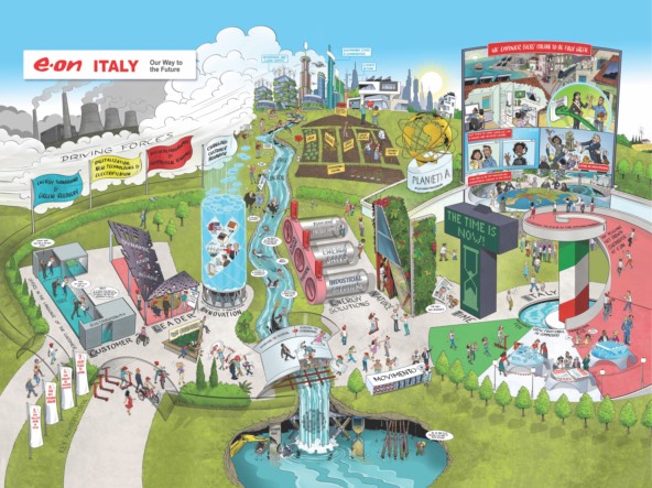 E.ON Italia CEO Frank Meyer and the TATIN Institute for Strategy Activation created a strategic map to represent Meyer’s ultimate vision for the company. Meyer then hung copies of the map throughout the office and made it his Microsoft Teams background. (Image courtesy of E.ON Italia)