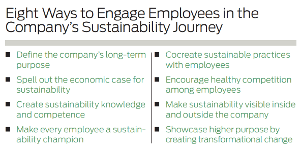 This article shares what we have learned about how leading sustainability companies approach these problems, and how they succeed in making a stronger link between the values of their employees and their daily work for the company. We also offer eight important practices for embedding sustainability internally and making it relevant to the entire employee base.