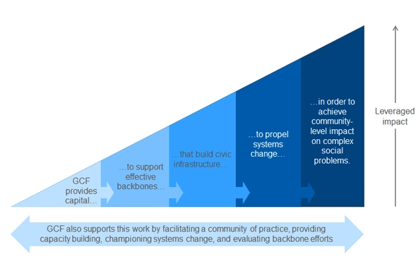 To evaluate the impact of the backbone organizations on each of these levels, we reviewed publicly available information, grant reports, and internal information provided by GCF and the backbone organizations themselves. We also interviewed backbone leaders, stakeholders, and GCF staff and board members, and surveyed organizations and individuals involved in each collective impact effort.