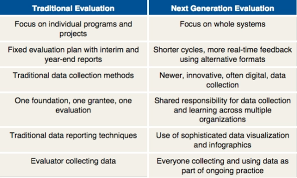 As part of our Next Generation Evaluation initiative, we reviewed literature, interviewed 15 thought leaders in the field, and studied organizations that are doing pioneering work around new ideas and approaches. Our research led us to identify six characteristics that unite the social sector’s most promising efforts to evolve and expand its practice of evaluation, summarized below. It is important to emphasize that we see these as complementary to, rather than outright replacements of, traditional evaluation approaches and methods.