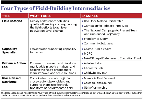 We already knew that such field-building intermediaries came in at least three flavors. (See “Emerging Taxonomy of Field-Building Intermediaries” below.)