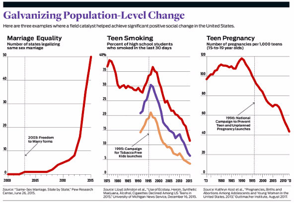 Out of the 15 fields that we examined, four are still working to achieve population-level change and three fields are emerging. However, we identified eight fields that did produce momentous change. In each case, field catalysts were a common denominator. That’s not to say they are the only factor of influence. But the consistency of their presence is striking. Indeed, in each of the eight fields that did exhibit significant progress, a catalyst emerged near a sharp inflection point.