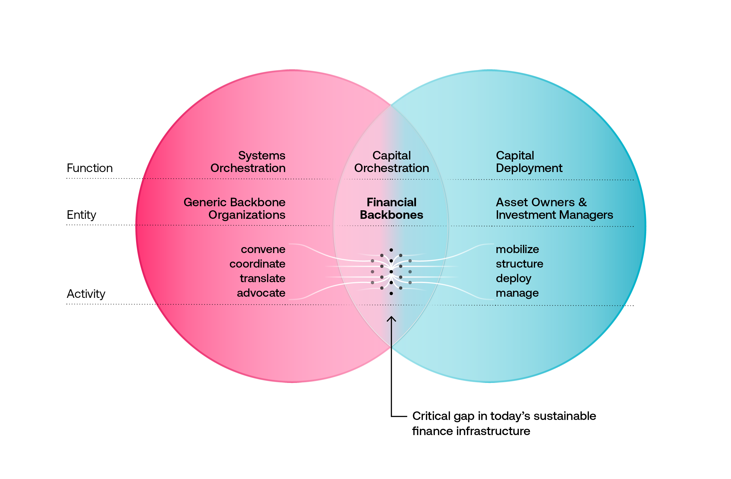 In the current sustainable finance ecosystem, nobody has a mandate—let alone the capabilities or resources—to coordinate such a collaborative effort. Financial institutions (such as banks, asset managers, pension funds, and family offices) typically focus on deploying capital on behalf of their principals or beneficiaries, not on orchestrating other capital providers interested in the same societal issues. Generic backbone organizations (a.k.a. field catalysts) are experts at systems orchestration, but they rarely have the expertise or compliance infrastructure to engage in investment activities. This is why we need a new archetype of system orchestrator: financial backbones.