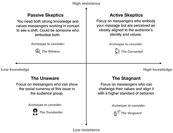 As we’ve just seen, there are many kinds of trusted messengers, but which should you partner with and when? The answer lies in understanding your audience. Recognizing that different people will require different communication strategies, start by asking two questions: How much does my audience already know and care about the issue, and how open or resistant are they to my message?