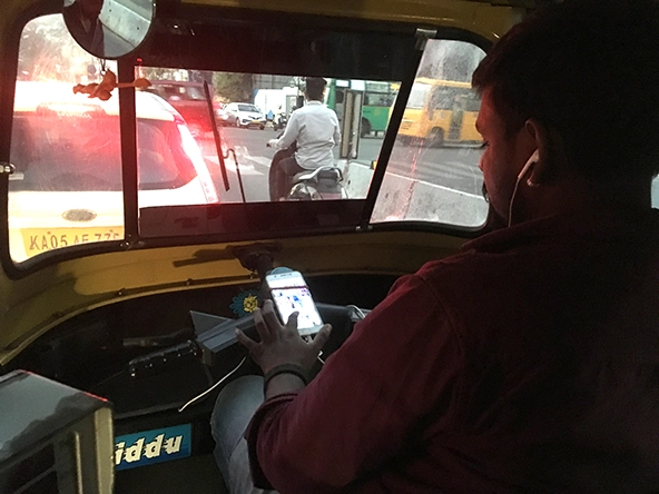 A rickshaw driver in Bangalore uses a payment facility on his phone. (Photo by Ximena Escobar de Nogales)