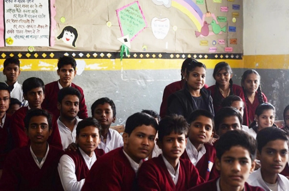 Mansi Gupta, a STIR teacher in a government school in Delhi, India, with her students. (Photo courtesy of STIR Education)