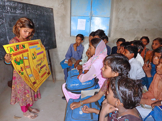 A girl in a Pakistani school guides her classmates through an Aflatoun lesson plan. (Photo courtesy of Aflatoun)