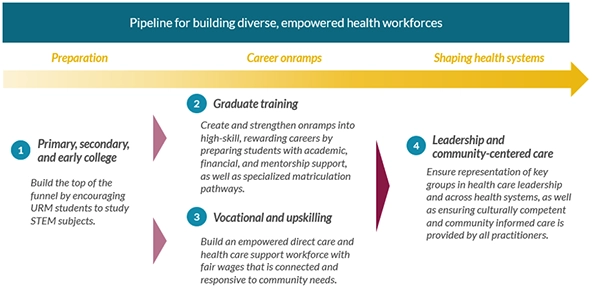 - Bridge programs connecting different educational stages and extending support: Transitionary periods when URM students are moving from minority-serving institutions—such as undergraduate HBCUs, community and tribal colleges, and mentorship programs—into schools outside of their community contexts are significant drop-off points. But programs that bridge high school to college, or community/tribal college to four-year schools, can support students through the changes, as can programs that bridge school to career transition and preparation, such as Health Career Connection.