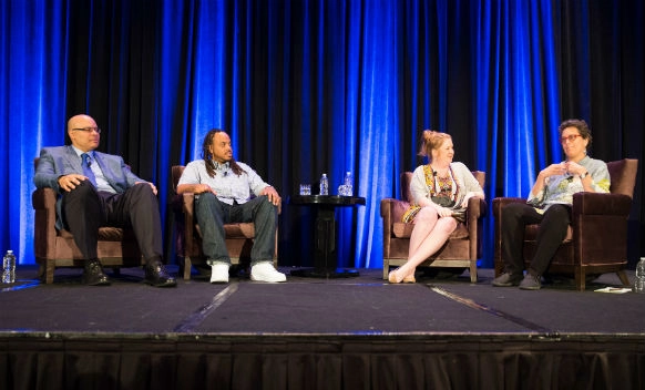 Fund for Shared Insight cochair Fay Twersky (right) moderates “The Future of Feedback” panel at the May 2018 Shared Insight Gathering of grantees and co-funders in Houston, Texas. (Photograph by Emma Marie Chiang, courtesy of The Fund For Shared Insight)