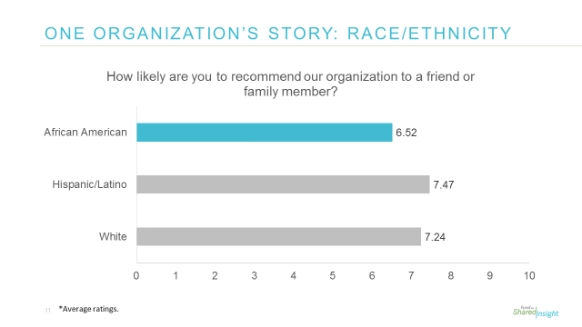 But there was disturbing news, too. The segmentation showed that, on average, youth respondents gave much lower service ratings. Most troubling was a first-blush finding that people of color on average rated services less positively than whites, but with variability by race and service. Deeper data mining showed a strong overlap between respondents of color and youth, blurring correlations. The real insight was that every organization would likely find racial, gender, age, and ethnicity insights if it disaggregated its data. “It was not that a particular group was consistently having a better experience than others,” Threlfall says. “The picture was more complex.”