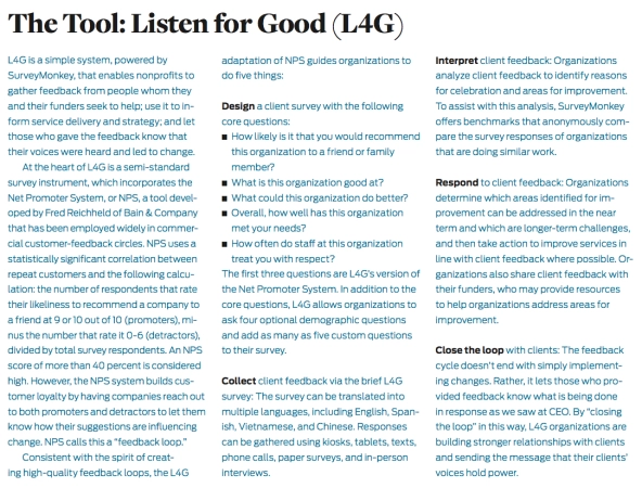 Marrying the basics of NPS with the experiences of marquee grantees like CEO led to L4G’s five-step process and five-question survey, which gets at intangible aspects of any service experience: Were you treated with respect? Empowered to achieve personal goals? (See “The Tool: Listen for Good” above.)
