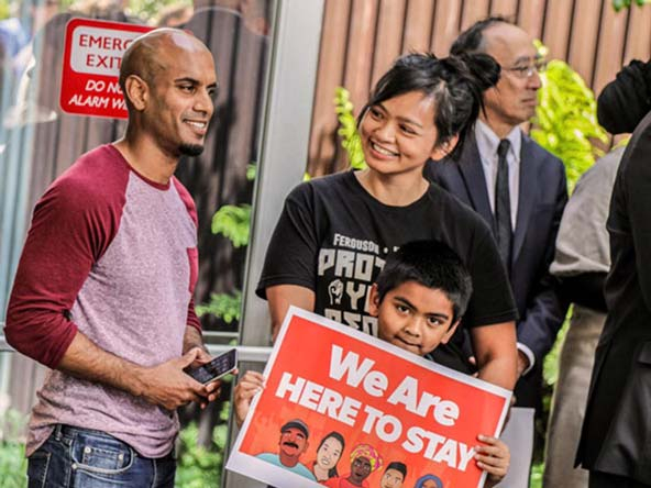 Raj Jayadev announces the US District Court's decision to halt President Trump’s executive order aimed at defunding sanctuary cities in April 2017. Silicon Valley De-Bug and partners filed an amicus brief to block the executive order as part of its mission to serve as a vehicle for community organizing. (Photo courtesy of Silicon Valley DeBug)