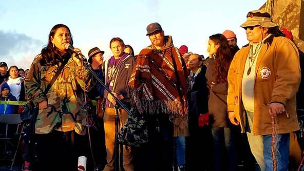 Morning Star Gali addresses a crowd at the Indigenous Peoples Sunrise Gathering, a convening she organizes annually. Gali works to draw attention to the disproportionate impact of the criminal and juvenile justice systems on Native Americans. (Photo by Norm Sands)