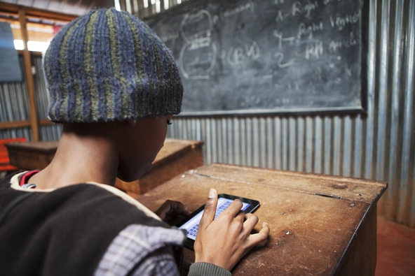 A student in Kenya uses a tablet with eLimu education software. (Photo courtesy of Qualcomm Wireless Reach)