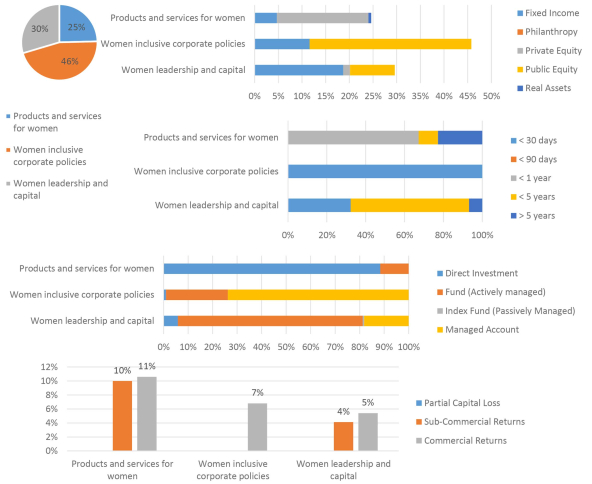 However, these amounts are a drop in the bucket of the overall financial system, and there remain investable opportunities across sectors, asset classes, and focus areas, including women-inclusive corporate policies, women’s leadership and capital, and products and services for women.
