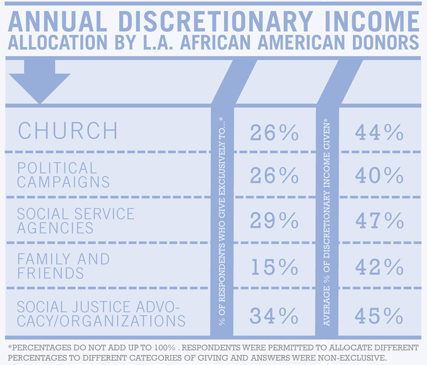And so I dove in. Together with Liberty Hill Foundation, I conducted in-depth interviews with five nationally recognized philanthropy experts, ran two focus groups of black donors, and distributed an online survey to hundreds of African Americans living all over Los Angeles County. The overwhelming majority of our research participants were part of what Robinson calls the “Mainstream African American community” in terms of income and their level of education. Here are some of the most interesting things we discovered: