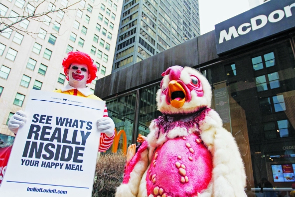 The Humane League, one of Open Phil’s grantees, stages a protest outside McDonald’s in downtown Chicago as part of its “I’m Not Lovin’ It” campaign