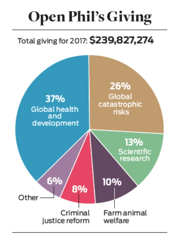 Open Phil is open in another sense as well: It got going with no devotion to any particular cause. Open to many possibilities, it funds an eclectic and seemingly disconnected set of causes, organizations, and projects: Global poverty alleviation. Criminal justice reform. Scientific research. Farm animal welfare. Existential risks to humanity. The Federal Reserve’s monetary policy. Solar geoengineering research. The history of philanthropy. Efforts to improve human decision making. Anything, really, that is judged to be an important and neglected problem that the organization can help solve.
