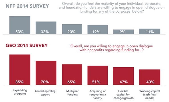 Nonprofit and foundation leaders disagree about whether foundations are open to dialogue on financial issues. (GEO’s 2014 Field Study and Nonprofit Finance Fund’s 2014 Survey)