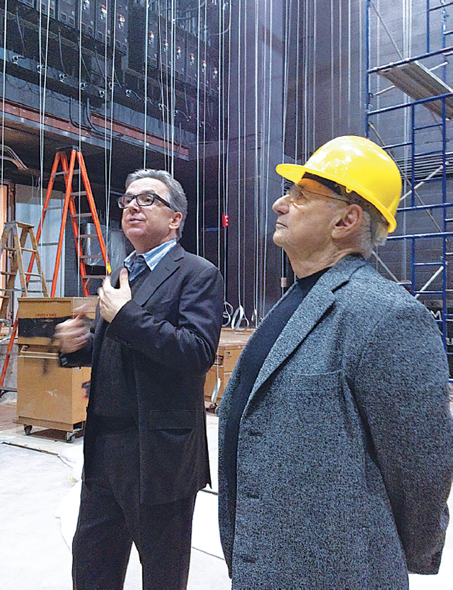 Signature Theatre founder James Houghton (left) tours his company's facility with architect Frank Gehry in 2011. (Photo by Elliott Forrest)