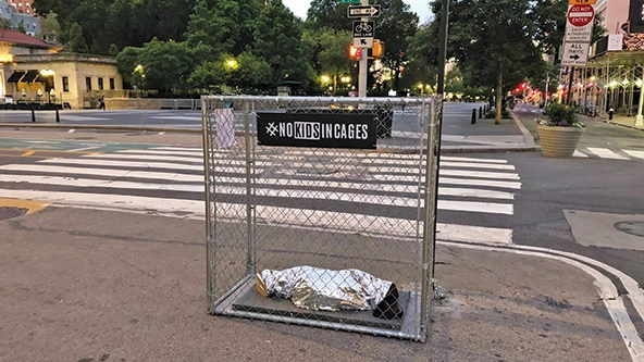 Twenty-four cages were placed near locations with heavy foot traffic in Manhattan and Brooklyn. Each cage contained a child mannequin wrapped in a foil blanket and was accompanied by an audio recording taken at a detention center that documents crying children and Border Patrol agents mocking those children.