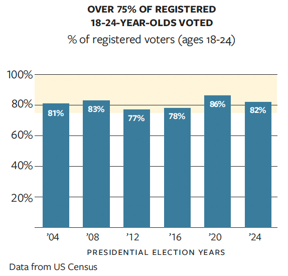 Many people assume that young people turn out to vote at low rates, even when they are registered. But that is not the case, at least in major national elections. According to US Census data, more than 75 percent of registered youth turned out in every presidential election going back to 2004. In 2020, 86 percent of registered youth turned out, and in 2024, 82 percent of registered youth turned out.