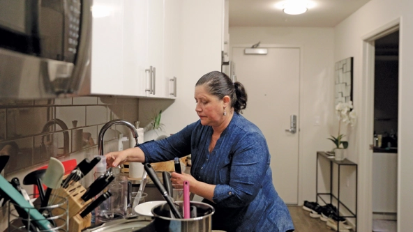 Lourdes Dobarganes cleans the apartment of a client in San Francisco. She is the kind of domestic worker Alia is trying to serve by allowing individual clients to chip in on benefits. (Photo by Carlos Avila Gonzalez, San Francisco Chronicle/Polaris)