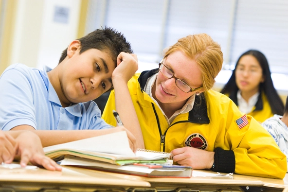 A City Year corps member tutors a student after school at Clinton Middle School in Los Angeles. City Year is one of three Diplomas Now partner organizations. (Photo by Elliot Haney)