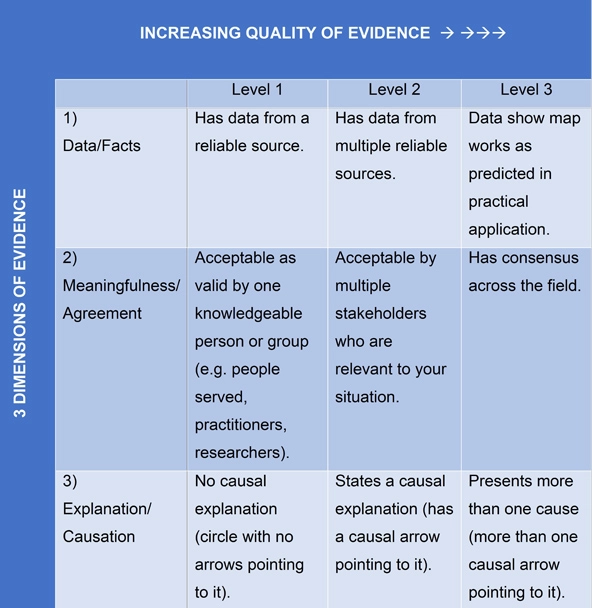 Ultimately, the closer your evidence is to “level 3” in all three dimensions, the greater your organization’s ability will be to make successful decisions and the more easily your organization will be able to demonstrate the benefits of its activities to stakeholders.