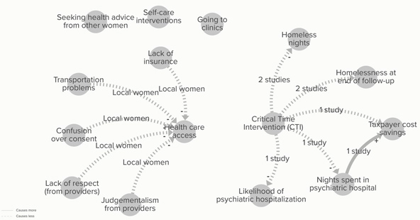 To improve these ratings, the organization might gather more studies to find missing explanations. It might discover new causal connections between points on the map. For example, improved health care access might decrease the likelihood of psychiatric hospitalization.