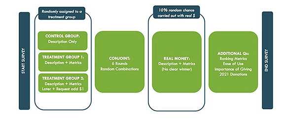 The theory we wanted to test was whether standardized comparable impact data—specifically, the five metrics above—is critical to solving an overarching problem in the charitable giving space: choice architecture. Choice architecture is the design of different ways in which choices can be presented to decision makers, and the impact of that presentation on decision-making.