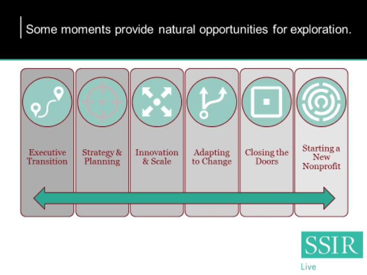 A collaborative project, The Power of Possibility, between BoardSource, The Bridgespan Group, La Piana Consulting, Propel Nonprofits, The Lodestar Foundation, Lyda Hill, and The Patterson Foundation, has zeroed in on six ripe moments in a mission-led organization’s business cycle to consider such alliances, with supporting case studies and how-to checklists to start the conversation. (View a webinar discussing these approaches here.)