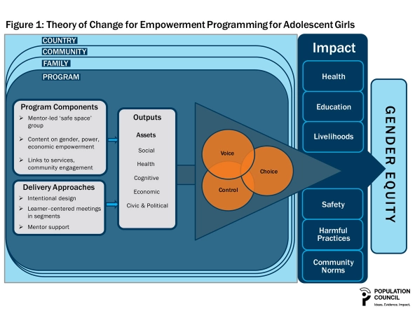 Based on our experience at the Population Council, which conducts research and develops solutions to health and development issues, and the evolving body of evidence on what works to improve girls’ lives, we developed a theory of change for empowerment programming for adolescent girls. This theory of change provides a practical framework for designing and implementing programs that center around girls’ diverse needs (such as saving money and preventing unintended pregnancy) and address multiple determinants of risk (such as social isolation or school drop-out). In doing so, these programs empower girls to make decisions and positively affect outcomes of importance to themselves, their families, and their communities. With its emphasis on inclusive intersectoral approaches, the framework also has relevance for adolescent boys and other demographics who may be disempowered because of social status, ethnicity, or disability.