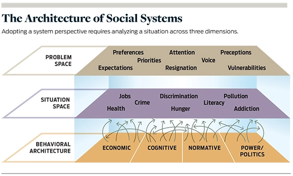 Behavioral architecture | Behavioral architectures are those parts of systems that cause situations to be a certain way. Exploring behavioral architectures entails understanding individuals and their relationships to other people, to institutions, and to the physical and natural environment. Accounting for the four dimensions of behavioral architectures—the economic, cognitive, normative, and power/politics dimensions—offers insights across several system levels: individuals, communities, organizations, institutions, and societies.12 This account helps explain behavioral patterns such as competition, cooperation, exclusion, dominance, and abuse.