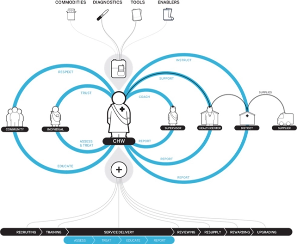 A CHW-centric model identifies all the essential physical, digital, and service-level components required to empower CHWs along their journey. (Image courtesy of frog design)