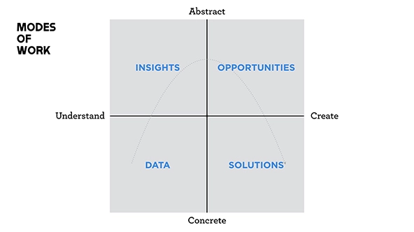 This work of sense-making is an act of abstraction: We move from the concrete (gathered information and observations) to abstract (a new perspective), and then back to concrete (new solutions). This abstraction helps us achieve new and meaningful viewpoints and solutions, rather than simply jumping to a quick fix for the visible symptoms of a deeper issue.