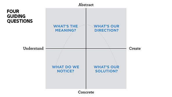There are many tools and techniques we can use for each of these modes. Which tool a team selects depends on the challenge at hand. (I will note some typical tools in the coming sections.) Four guiding questions can help frame our work: What do we notice? What’s the meaning? What’s our direction? And what’s our solution?