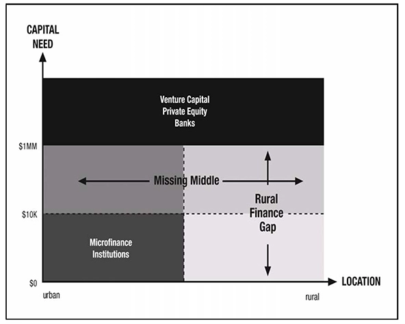 All of the above is compounded when accounting for the size of the investment. Generally, the bigger the investment the greater the ease with which transaction costs can be earned back. By contrast, the transaction cost of small deals is high relative to the amount invested. The result is a gap in agricultural finance between small individual (micro-)loans on the one hand and industrial loans on the other. This shortage in the availability of this specific type of capital—roughly speaking, between 50,000 and 1 million EUR, is referred to as the missing middle, first coined by Brian Milder in his article in Practical Action.
