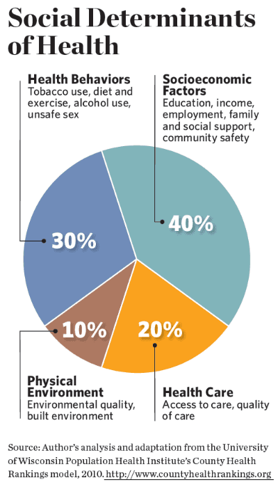The concept of the social determinants of health, introduced by the World Health Organization (WHO) about a decade ago, has been an important tool for explaining how the social and economic structures that shape how people live also affect their health. WHO’s determinants cover a broad spectrum of social, economic, and environmental factors. Included among them are access to health care and education; the distribution of power, income, and goods and services in a community; and other conditions at work, at home, in neighborhoods, and in the surrounding environment.
