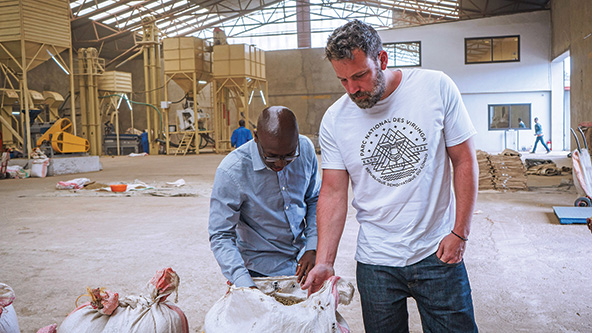 Eastern Congo Initiative (ECI) cofounder Ben Affleck (right), and former ECI staff member and country director Baraka Kasali, inspect beans at a coffee processing center. (Photo courtesy of ECI)