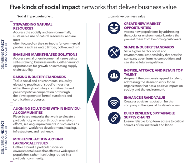 At the heart of any social impact network that involves businesses is a value exchange that gives both business and social change leaders a reason to make participation a strategic priority. Social change leaders have a better shot at engaging the private sector if they can provide value to companies, both directly to their core lines of business and indirectly by addressing their broader needs.