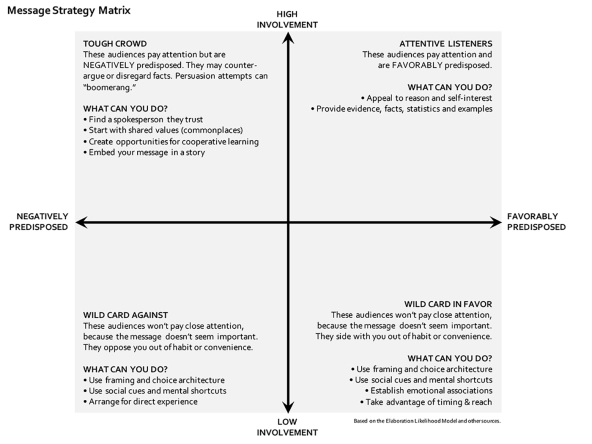 Predisposition is important, because it’s hard to change people’s minds. Even when communicators are successful in the short term, audiences often revert to their prior attitudes in the long run. And because people tend to seek out information that confirms what they already believe (confirmation bias), predisposition also affects what they hear. This doesn’t mean you should avoid those who strongly disagree. But, with limited resources, it does mean you should pick your battles—and your approach—wisely. The Message Strategy Matrix has four quadrants: